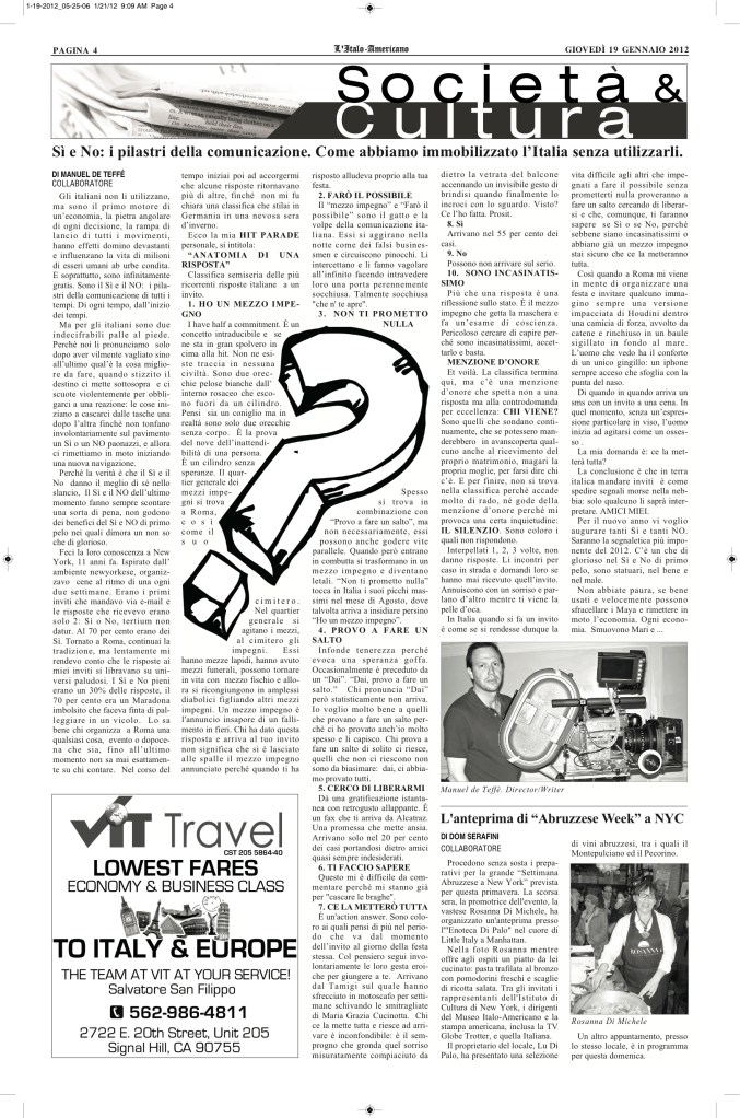 Per il nuovo anno vi voglio augurare tanti SI e tanti NO. Saranno la segnaletica più imponente del 2012. C’è un che di glorioso nel Sì e No di primo pelo, sono statuari, nel bene e nel male. Non abbiate paura, bene usati e velocemente possono sfracellare i Maya e rimettere in moto l’economia. Ogni economia. Smuovono Mari e